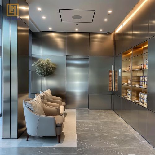 - Trang trí kiến trúc: Sử dụng để ốp cabin thang máy, ốp tường các tòa nhà và trung tâm thương mại, tạo điểm nhấn và nâng cao tính thẩm mỹ cho không gian.